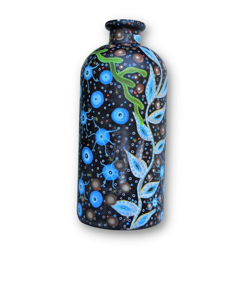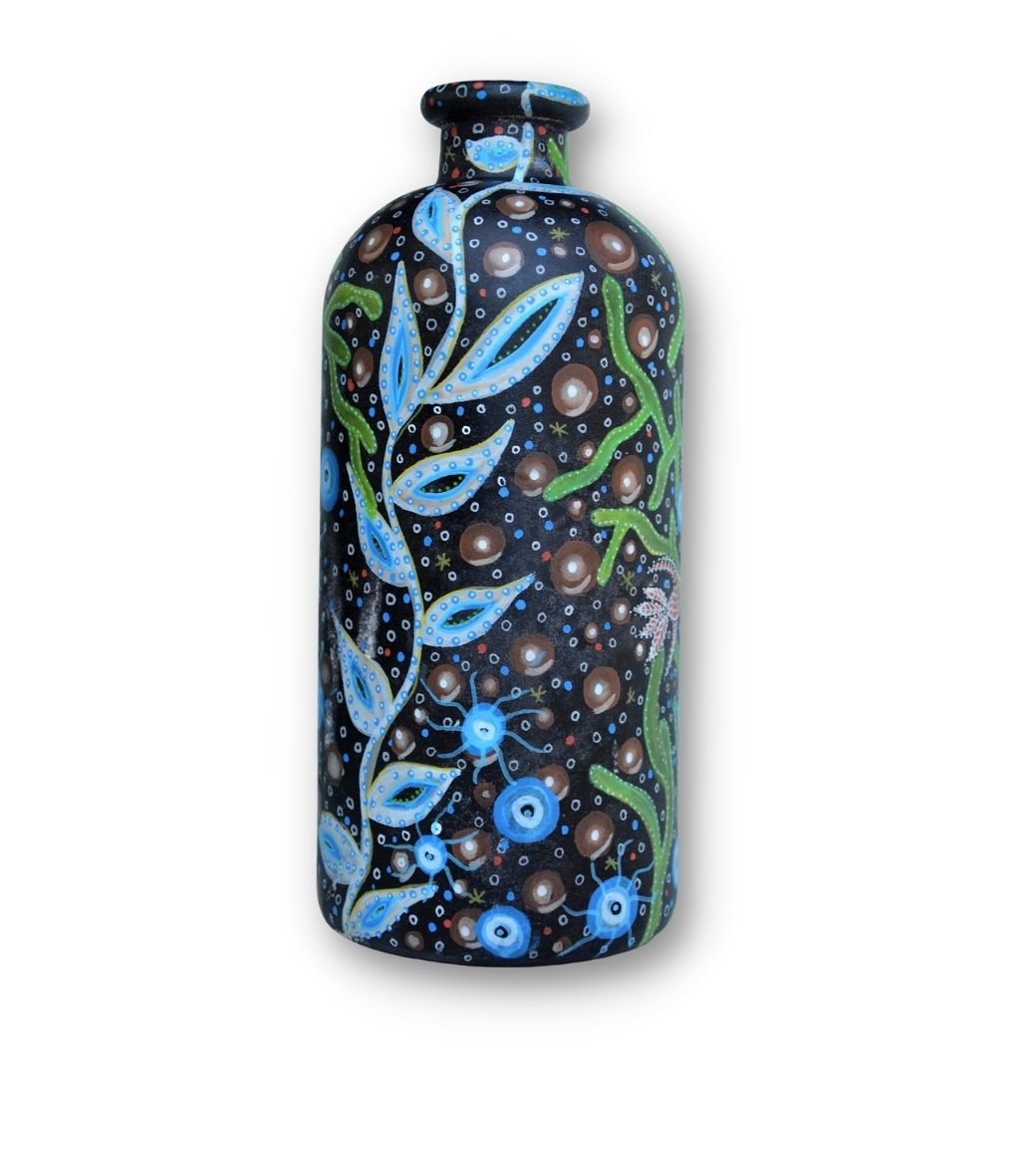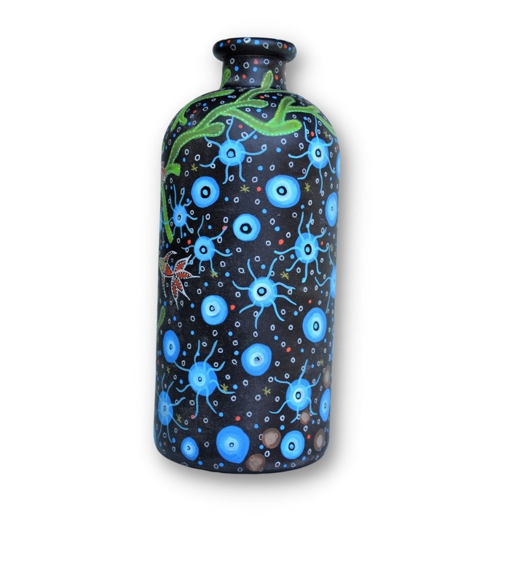 Pigmenteret blæk på glasvase med sandet overflade.