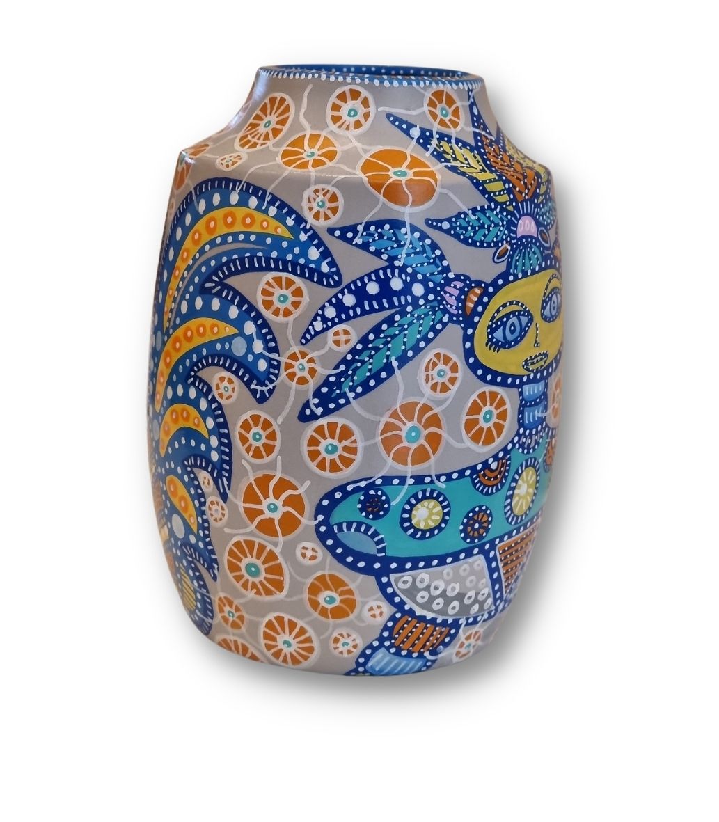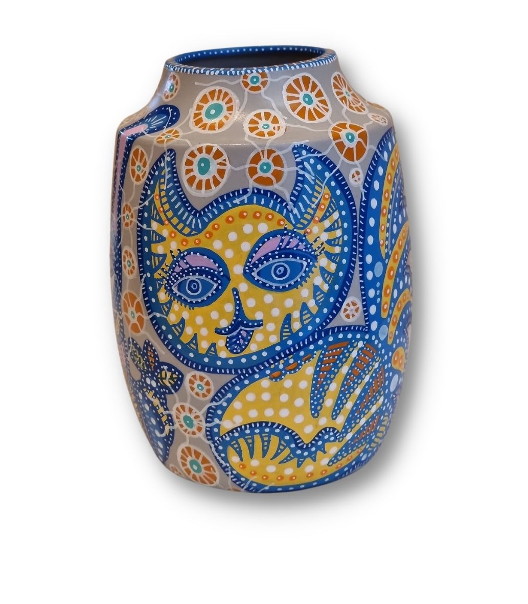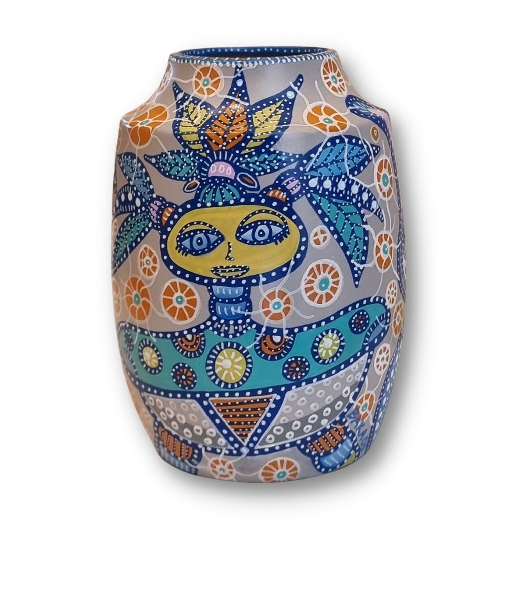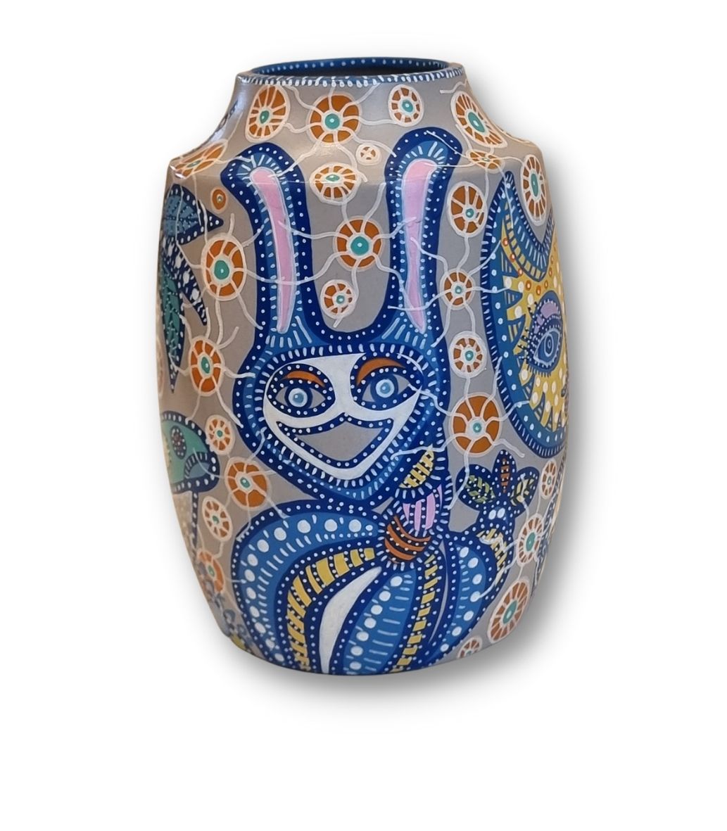En form for upcykling af et allerede eksisterende emne, som f.eks. denne vase (som hun ikke selv har skabt), der her danner baggrund for hendes kunst. Kun fantasien sætter grænsen.
