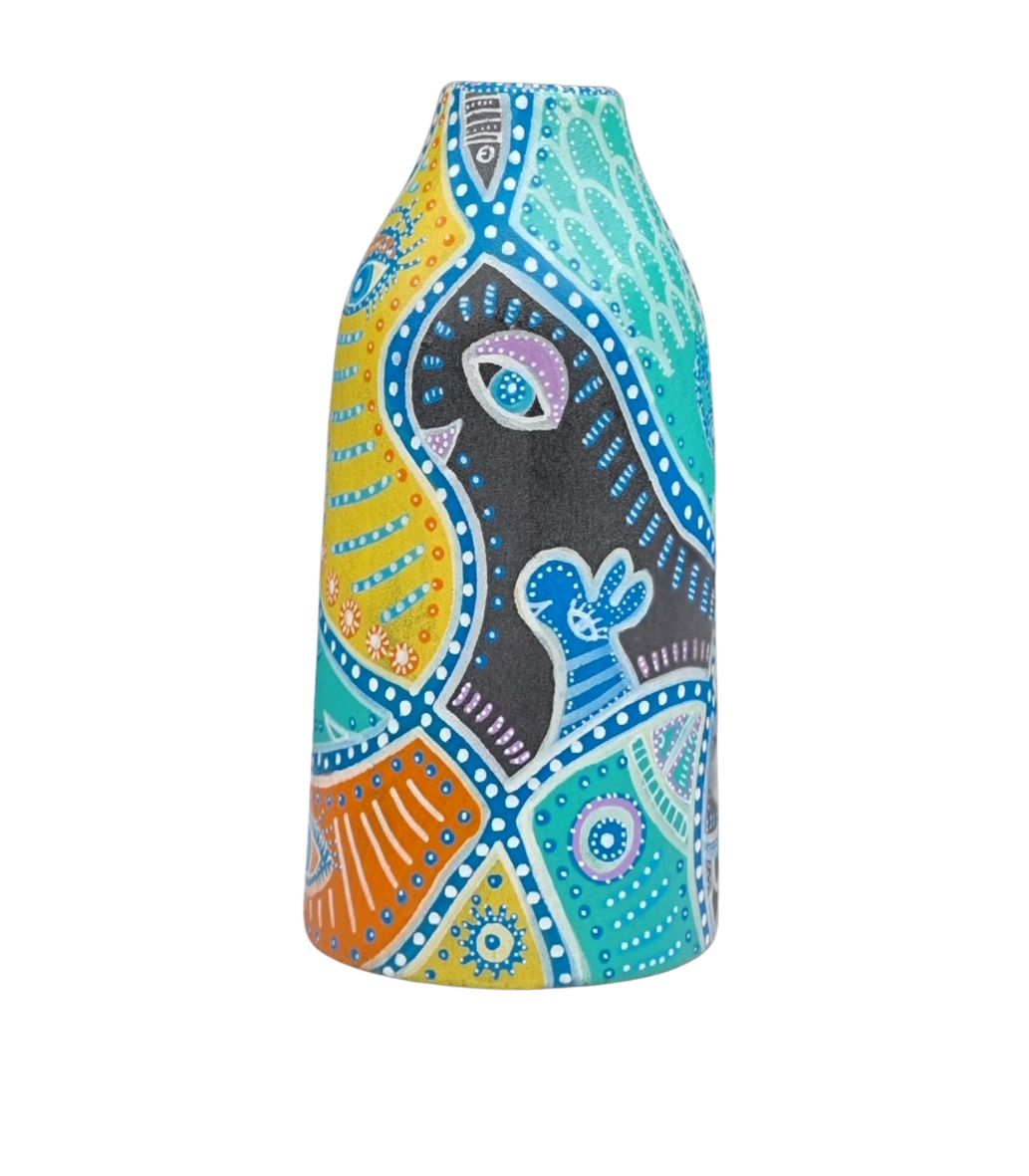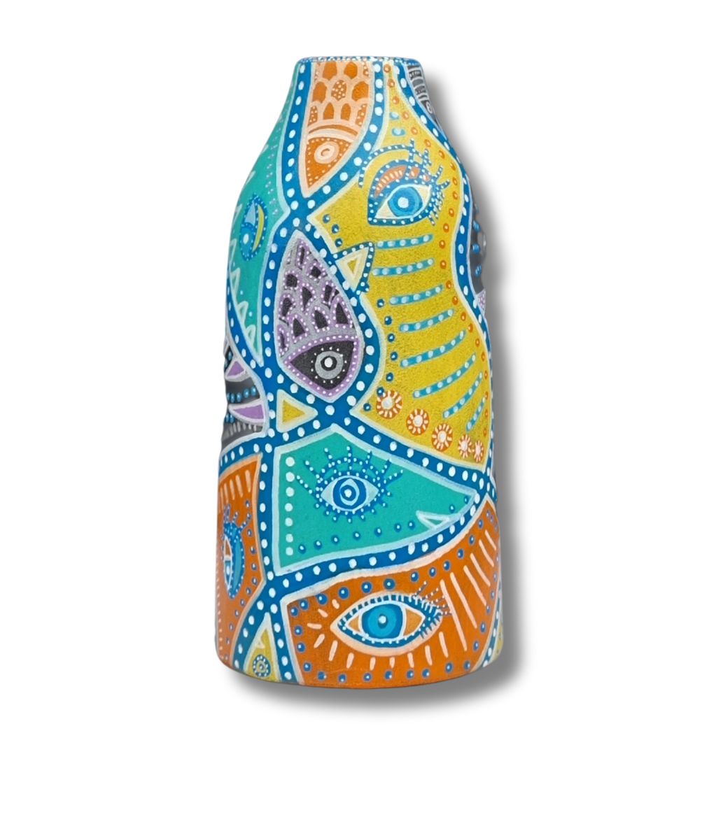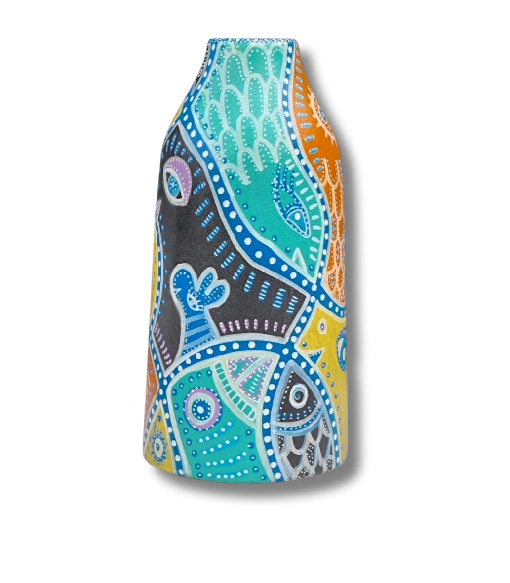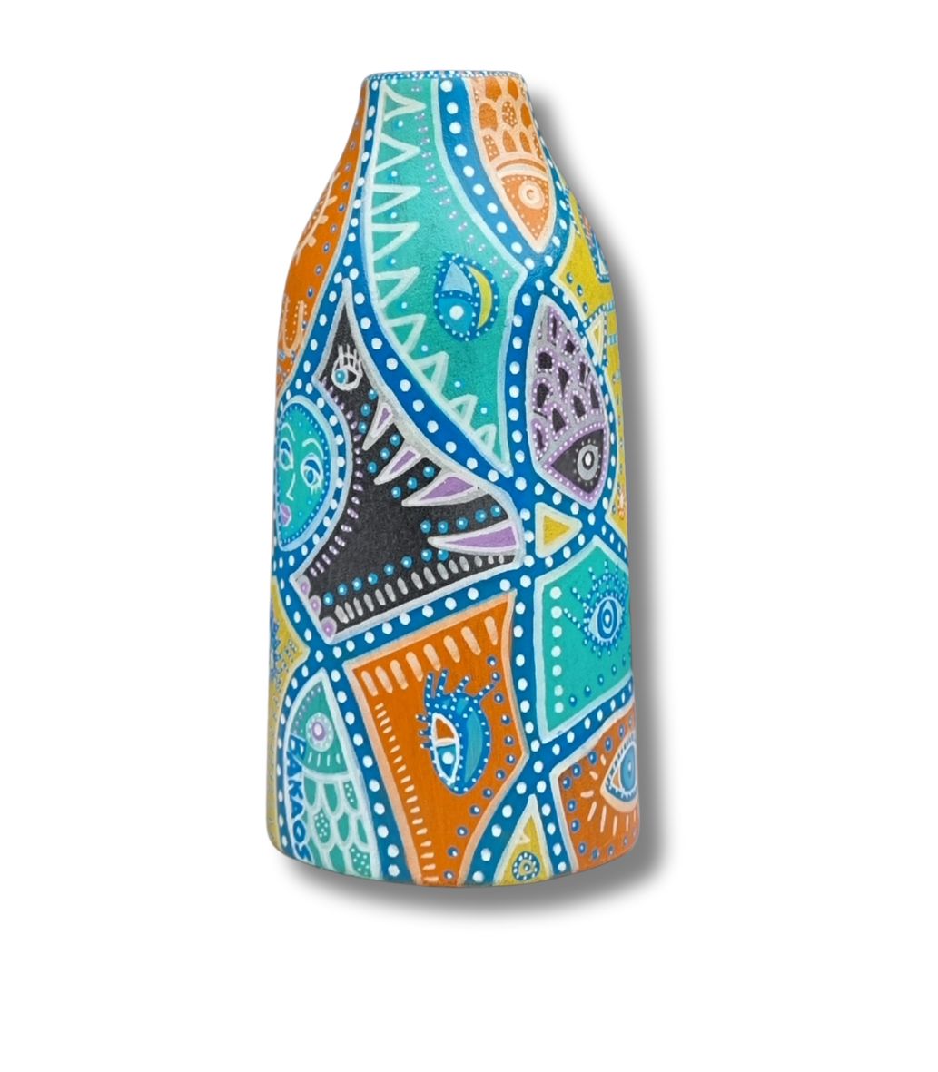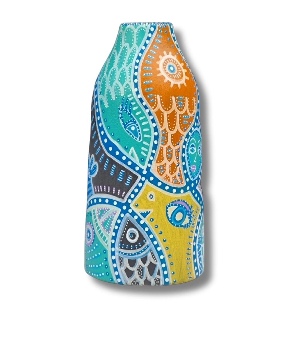 En form for upcykling af et allerede eksisterende emne, som f.eks. denne vase (som hun ikke selv har skabt), der her danner baggrund for hendes kunst. Kun fantasien sætter grænsen.