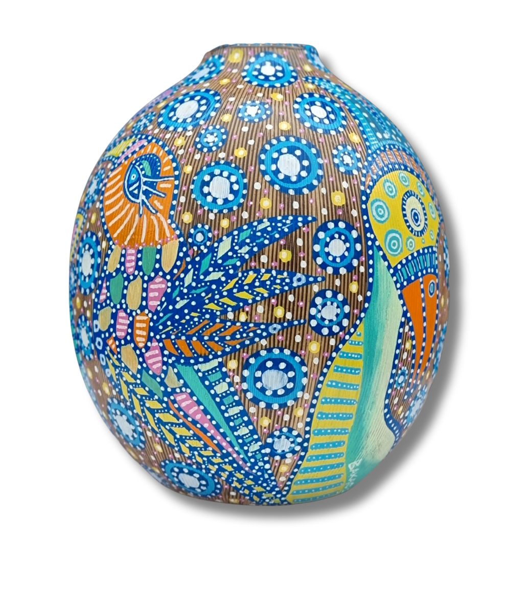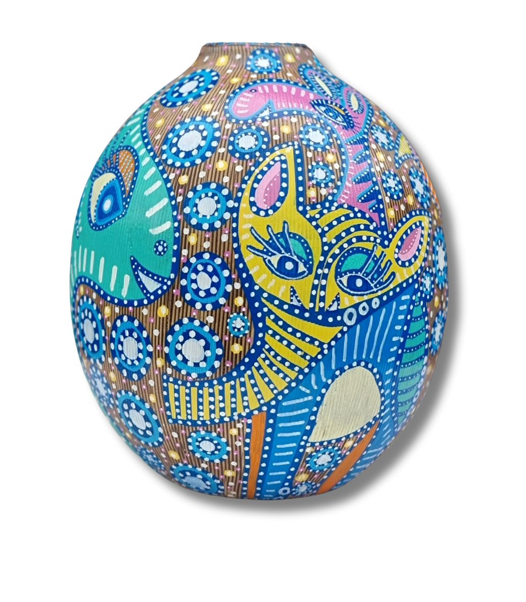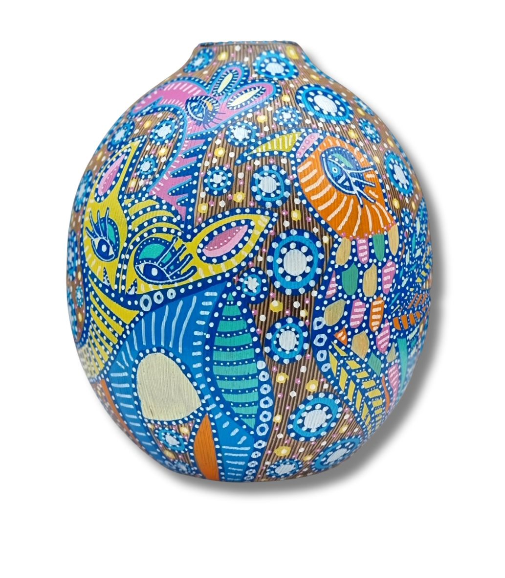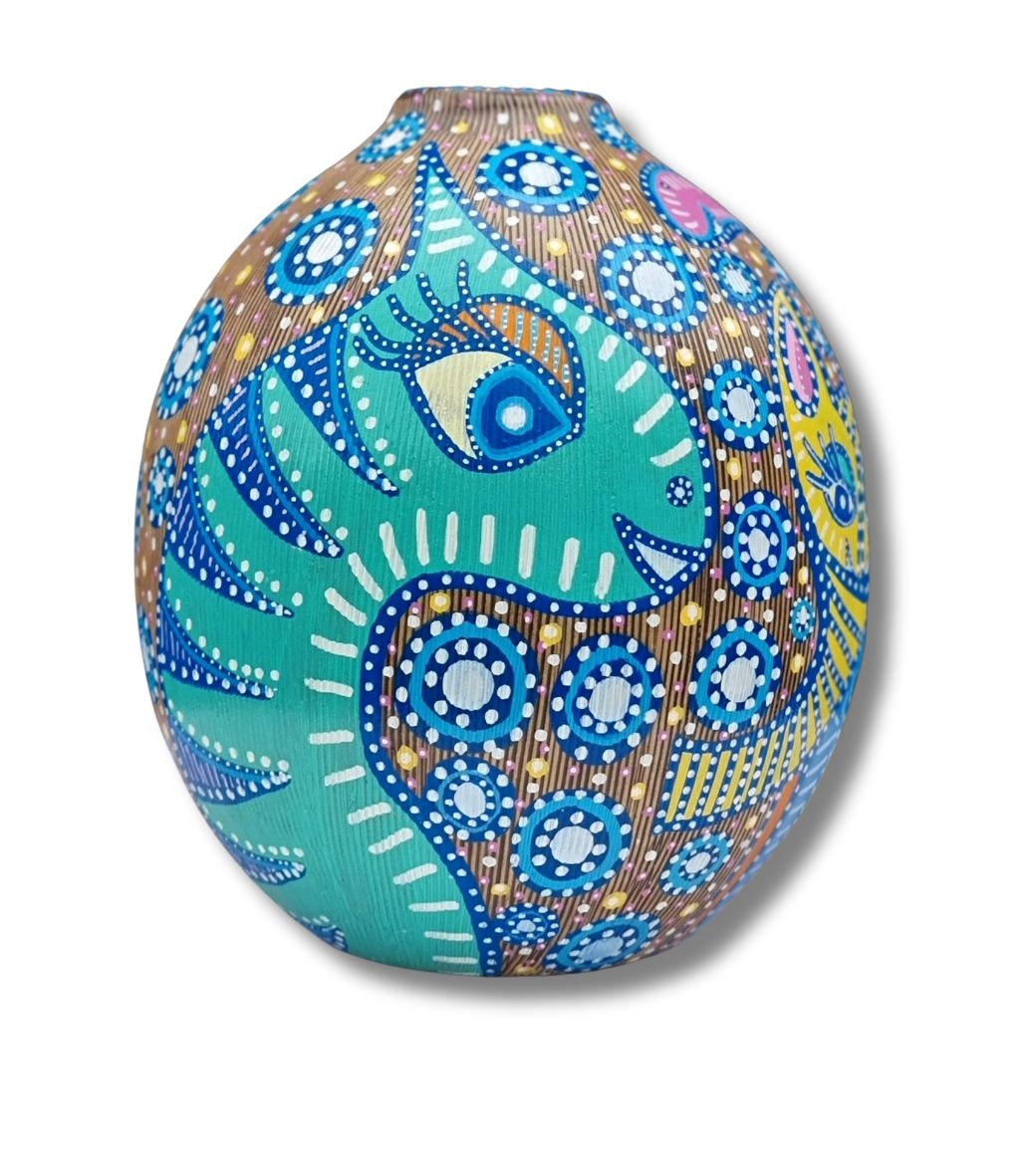 En form for upcykling af et allerede eksisterende emne, som f.eks. denne vase (som hun ikke selv har skabt), der her danner baggrund for hendes kunst. Kun fantasien sætter grænsen.