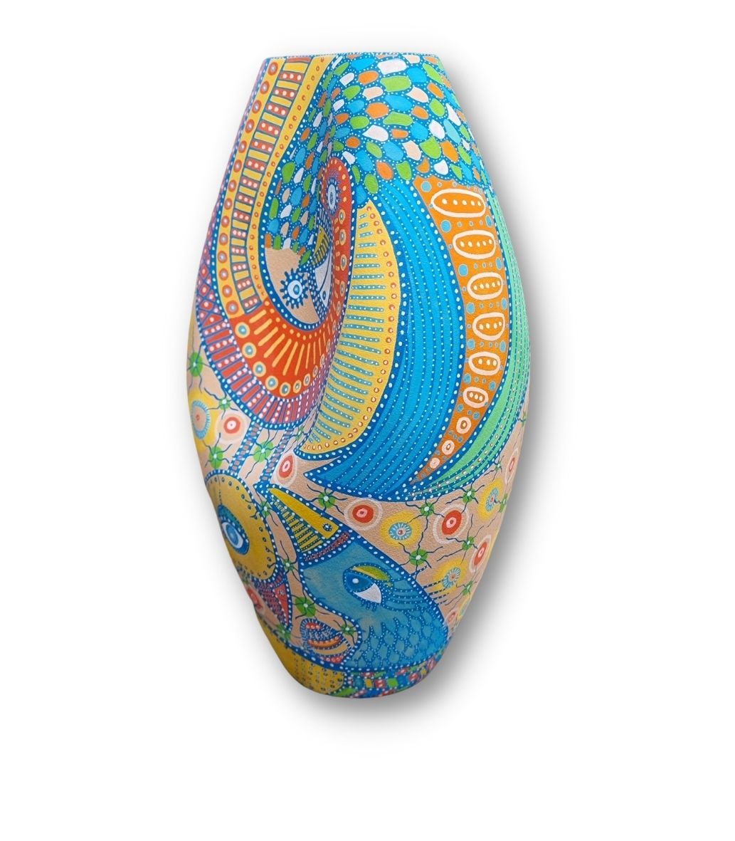 En form for upcykling af et allerede eksisterende emne, som f.eks. denne vase (som hun ikke selv har skabt), der her danner baggrund for hendes kunst. Kun fantasien sætter grænsen.
