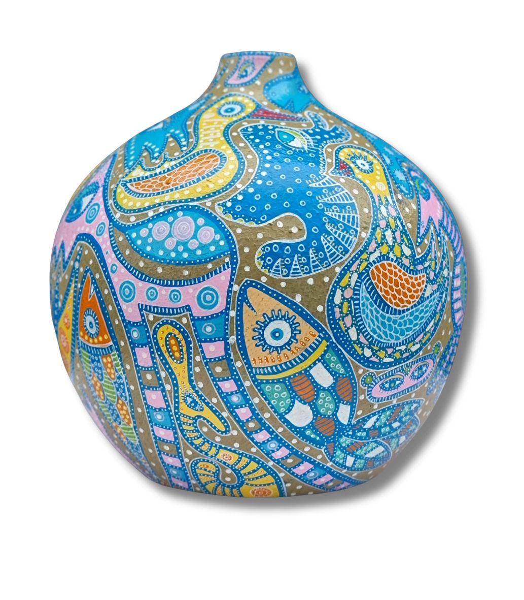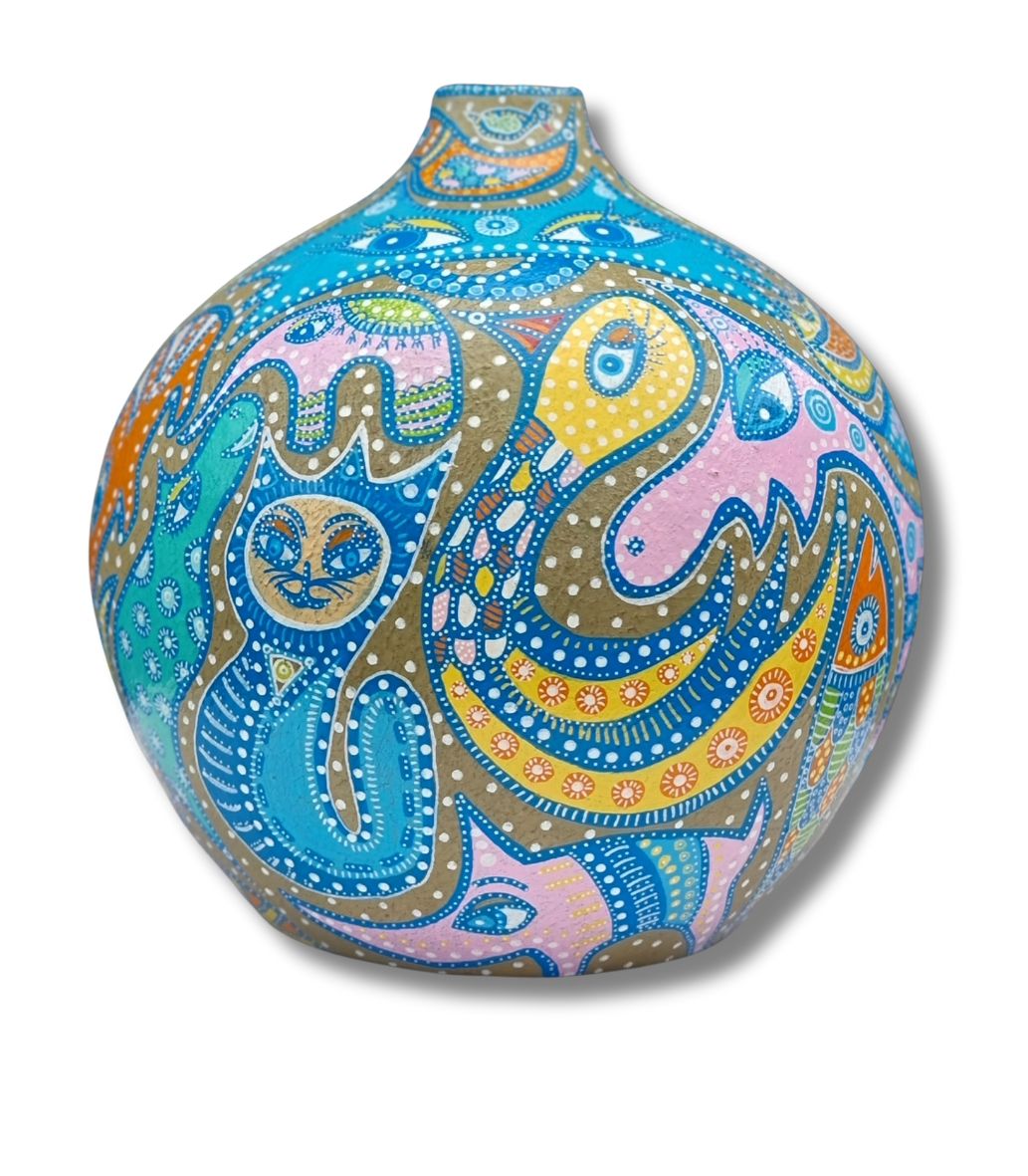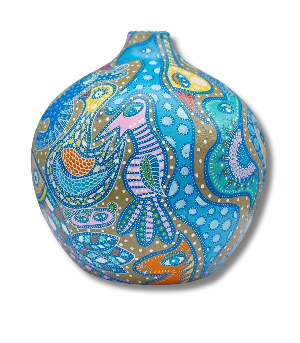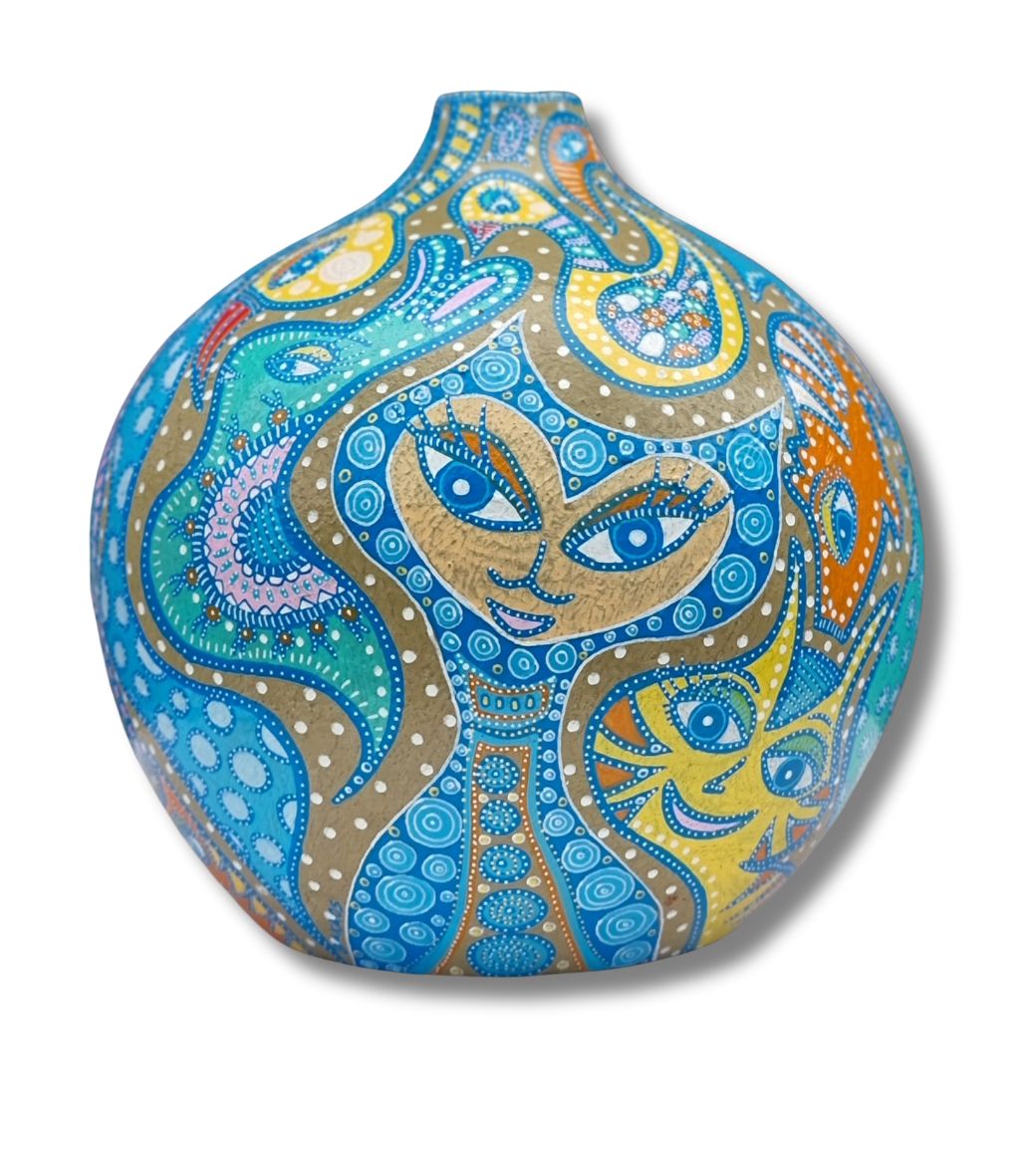 En form for upcykling af et allerede eksisterende emne, som f.eks. denne vase (som hun ikke selv har skabt), der her danner baggrund for hendes kunst. Kun fantasien sætter grænsen.