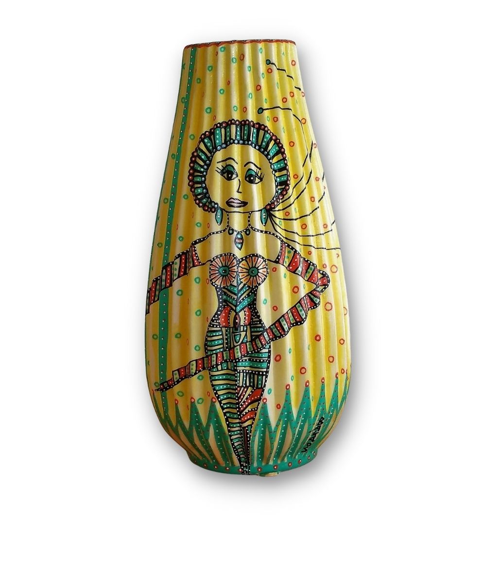 Forestil dig at du skal tegne på denne zig-zaggede overflade, hvor det hele tiden går op og ned, op og ned… og hvor ALLE streger skal være sat korrekt først gang, hen over vasens takkede overflade. Forestil dig at du skulle tegne en figur med krop, arme og et rundt ansigt med øjne næse og mund der er placeret symmetrisk – uagtet hvor på ’zigzagget’ f.eks. øjet, og iris, skal placeres.