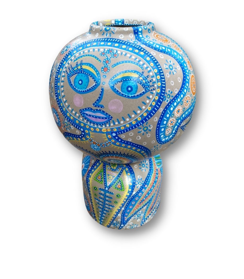 En form for upcykling af et allerede eksisterende emne, som f.eks. denne vase (som hun ikke selv har skabt), der her danner baggrund for hendes kunst. Kun fantasien sætter grænsen.